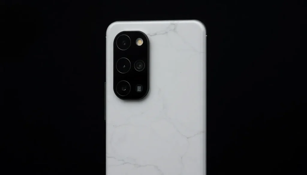 Outro ponto estético notável neste modelo específico é a textura traseira que imita mármore. É importante notar que, apesar da aparência de pedra, trata-se de um vidro com acabamento fosco, que também conta com a proteção Corning Gorilla Glass 7i, presente tanto na frente quanto atrás.