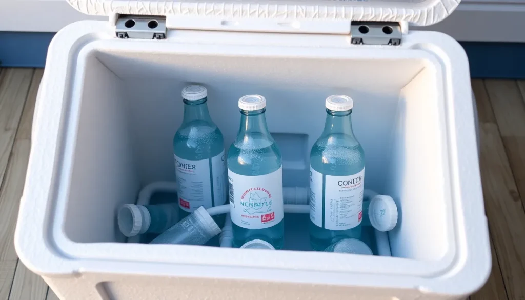 Para otimizar o resfriamento, recomenda-se o uso de garrafas de água congeladas em vez de gelo solto. Garrafas congeladas tendem a durar mais tempo e mantêm o interior do cooler frio por mais tempo.