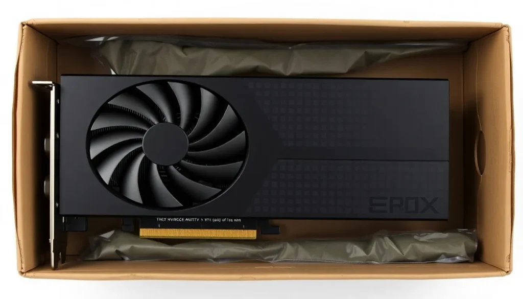 A apresentação da caixa é um ponto forte. A embalagem da série 50 é construída predominantemente com papelão reciclado, conferindo um aspecto rústico, mas robusto, em contraste com as caixas mais estilizadas e “premium” das gerações anteriores (como a caixa preta com linhas douradas da 3080 Founders). A caixa atual é grande, quase quadrada, e revela a placa através de um mecanismo de puxar feito de papelão.